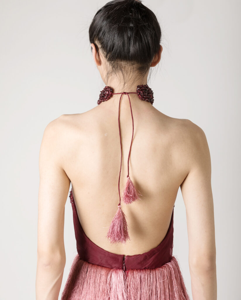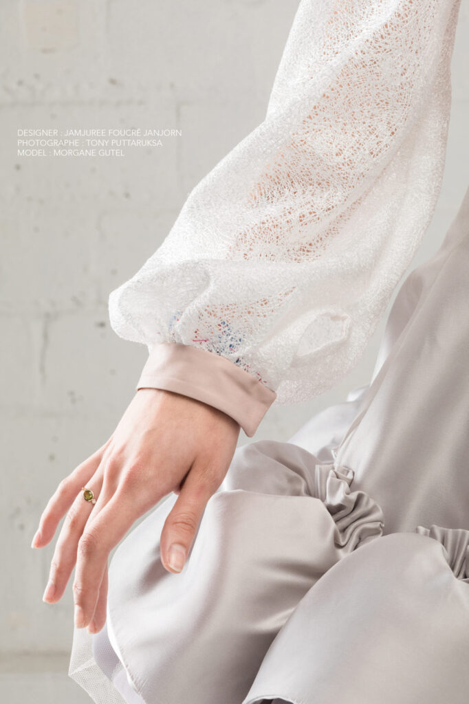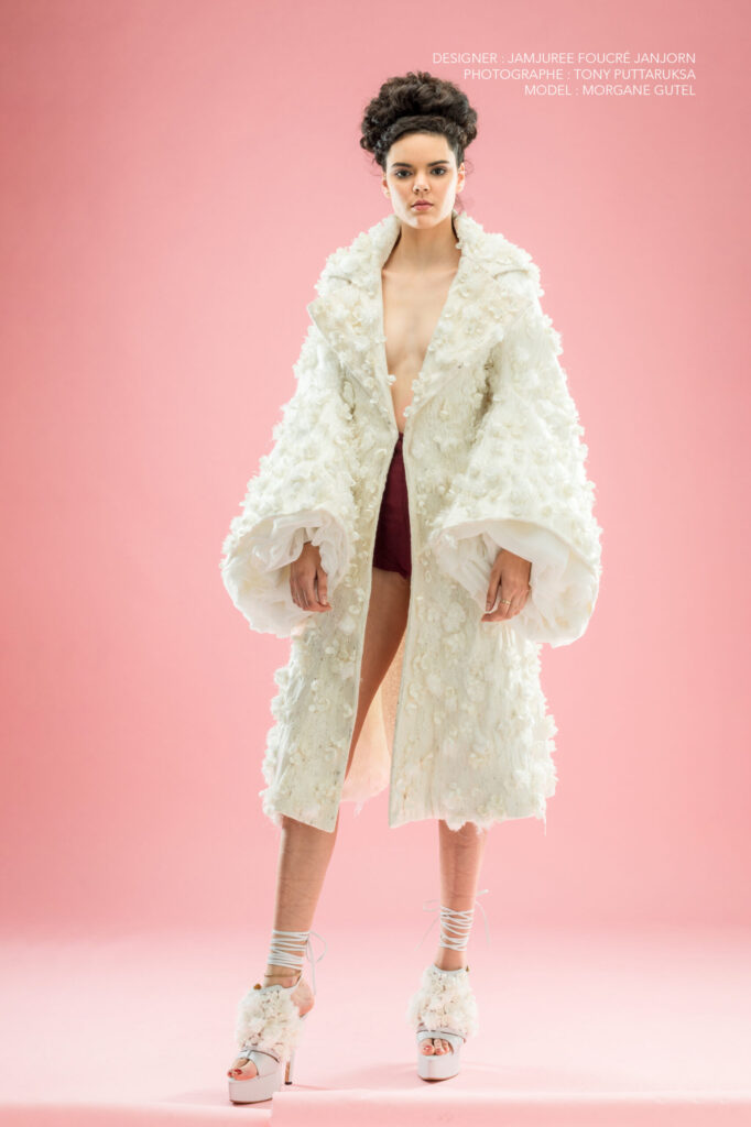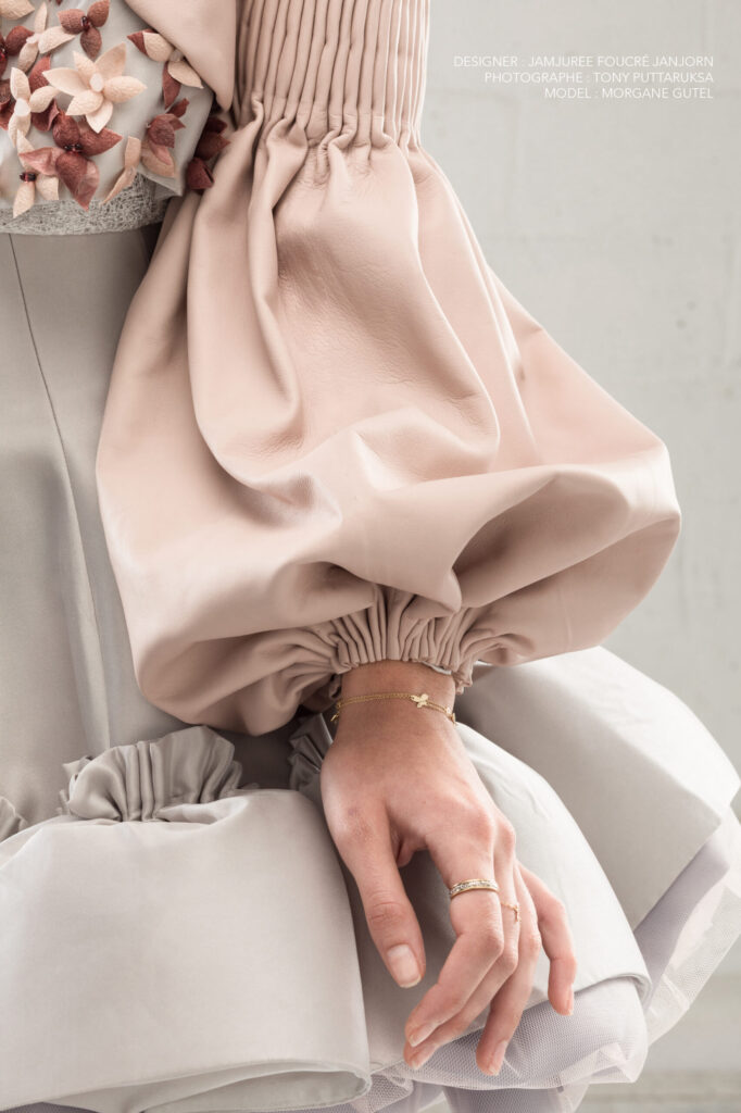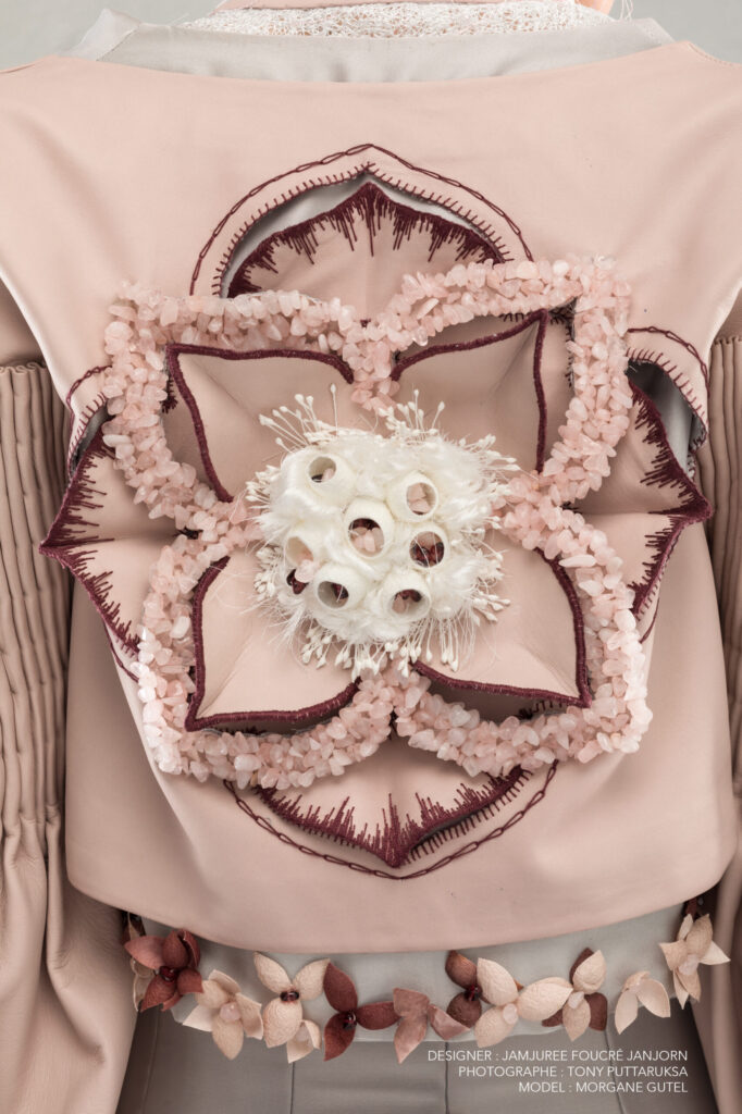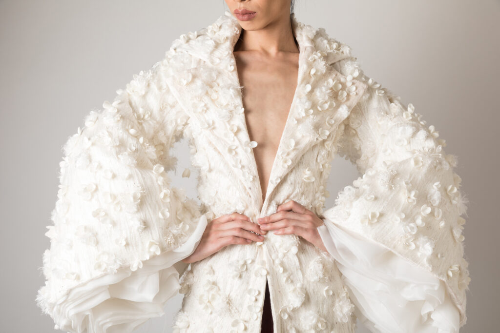 En associant des matières à la fois originales et naturelles, la créatrice fait preuve d’une intuition décidément moderniste qu’elle s’applique néanmoins à mettre au service de la Haute Couture traditionnelle française.